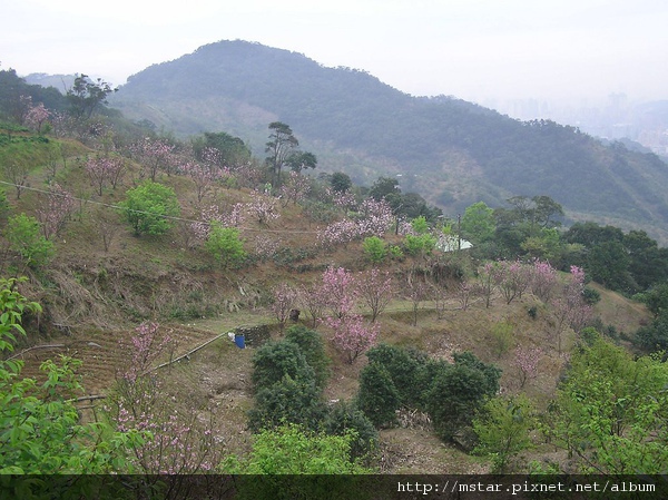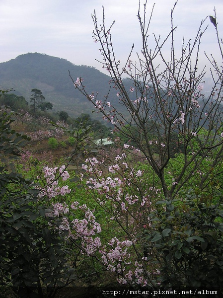 循上次相同的路線,輕鬆上待老坑山;下左側稍陡的樓梯,繼續往下個山頭 (直走是通杏花林另一邊,並可繼續走到救千宮),途中有一段柏油路。在土地公廟附近看到農園內開得很漂亮的花樹: