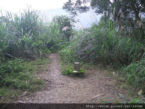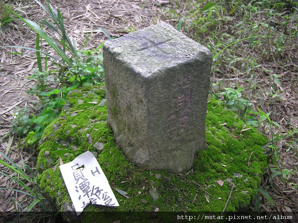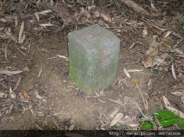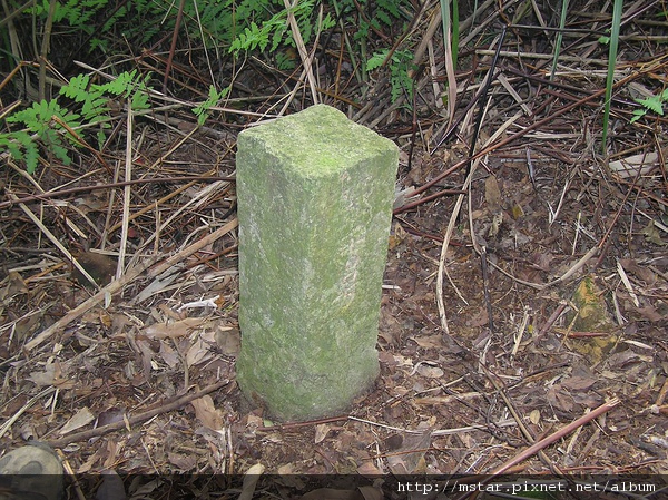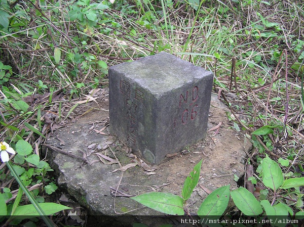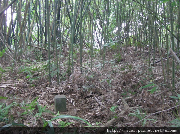 穿過封路鐵鍊,循楞線上寬敞到可開車的土路走,經過電塔之後路徑開始不明顯、又出現竹林,許多處無法穿越而只能從旁繞過。接近基石處可看到右手邊小丘上的路條與山頂標示牌,登上小丘可在左手邊發現基石。