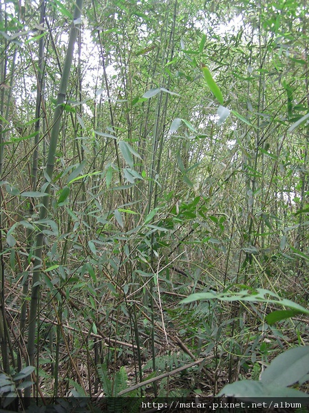 然後又是難走的竹林,還好前人稍砍出了一些缺口,可以跟著走穿過去。圖資上畫可以從北側下山繼續走,但實際上是陡坡且竹林、倒竹擋路,東側又是很高的駁崁,必須在中途就從菜園出去,接上循寬敞的土路。