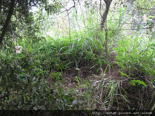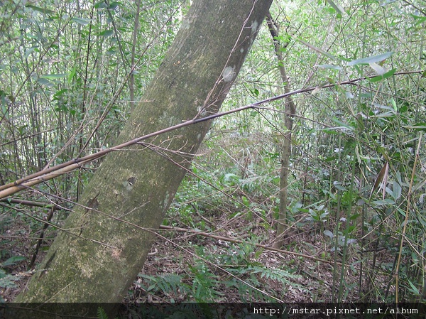在途中看到右手邊草叢有個缺口,樹上還綁了路條,阿泉坑山西北峰的東北側該不會就是從這下山吧?不過已經沒興趣再爬上探究了。
