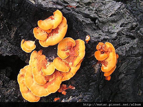 途中看到長在枯木上的疑似「血紅密孔菌 (林投菇)」(Pycnoporus sanguineus」