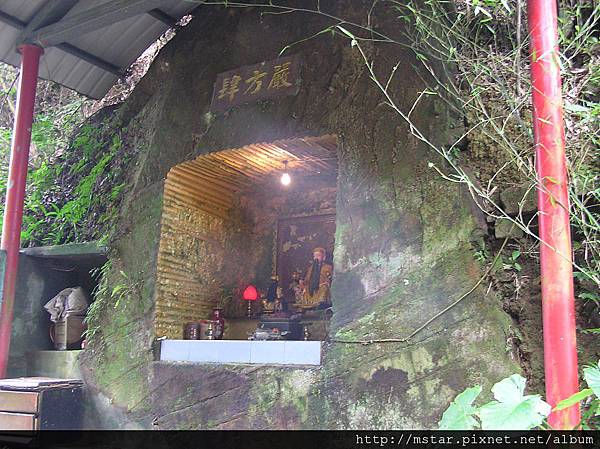 踩石頭跨過水不多的溪,踏前人在岩石上鑿出的階梯往上,沒多少距離就接上柏油路,左方是四面頭山下來處,直走有座土地公廟。