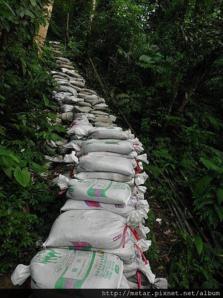 從車道往前不遠,右手邊就是通往瀑布的路徑,一開始是幾個輪胎+水泥做成、避免浸水的踏腳點,之後開始上坡,有裝了砂石的麵粉袋堆疊成的階梯。
