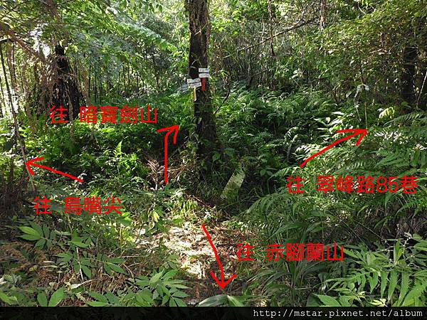 直接騎車殺上翠峰路,停在 85 巷巷口開始沿著車道往上走。經過幾戶住宅前面,走到上星期離開的登山口;開始走山路沒多久就抵達赤腳蘭山與暗寶劍山之間的鞍部十字路口。