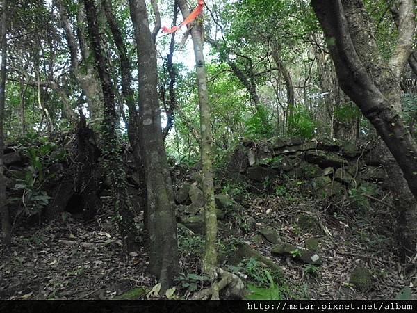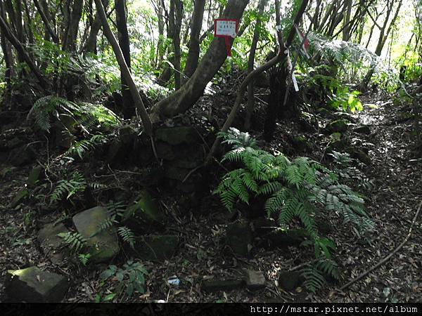 原路退回鞍部,再往西走。穿過一片竹林,再抓繩子陡上一小段,之後是緩坡,然後到達隘勇寮遺跡。