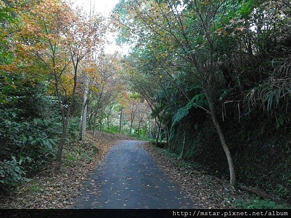 路旁有好幾棵轉黃紅色的樹。