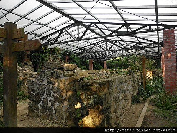 往北沿山腰路徑走,有個隘勇寮遺跡。官方還拿經費蓋了遮雨棚。