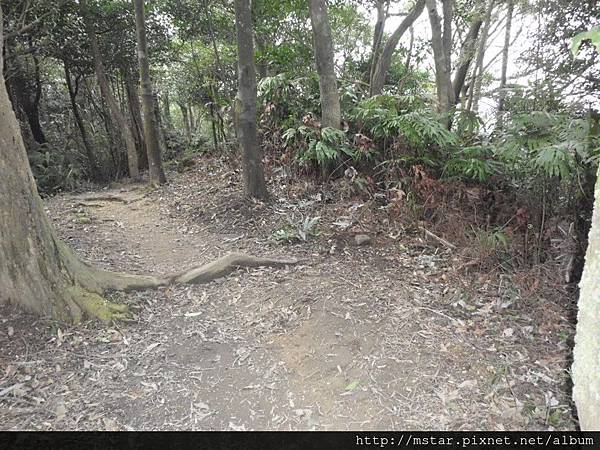 從土地公廟旁的階梯繼續往東,先是石階、後為樹根構成的土階,略陡上坡。