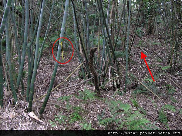 走到鞍部看到綁在竹子上的黃色路條,開始左轉上山。