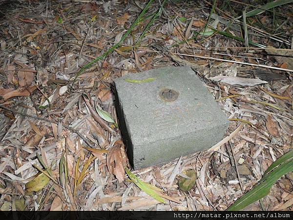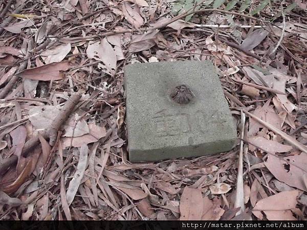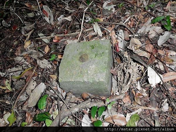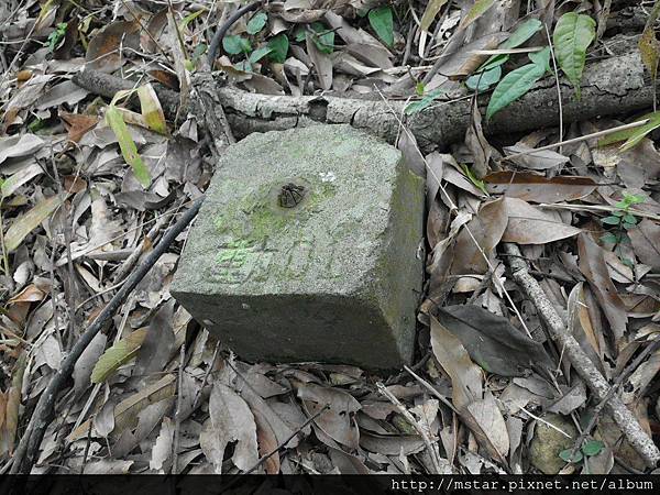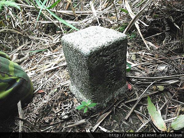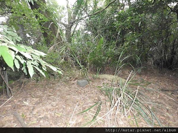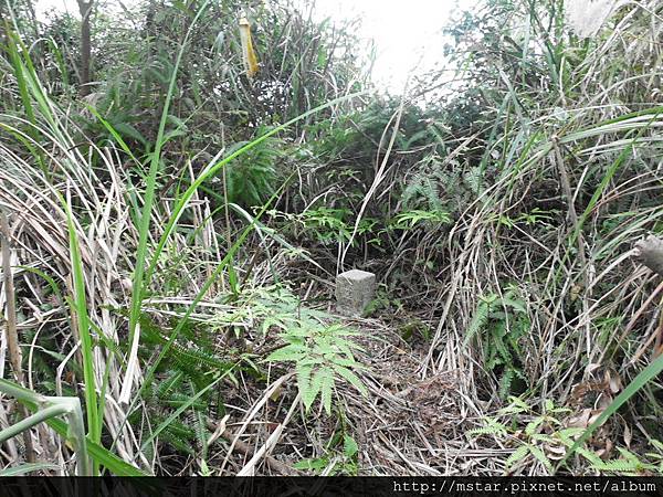 右轉沿著鐵絲網旁邊往山上行,途中從被倒樹壓出的缺口進入細竹林,然後爬六七十度的陡坡往上。接近山頭有個巨大的水泥建築物擋住路 (似乎是墳墓?),只能小心翼翼從右邊慢慢攀爬而上;攀上後,再往南不遠就是基石所在山頭。