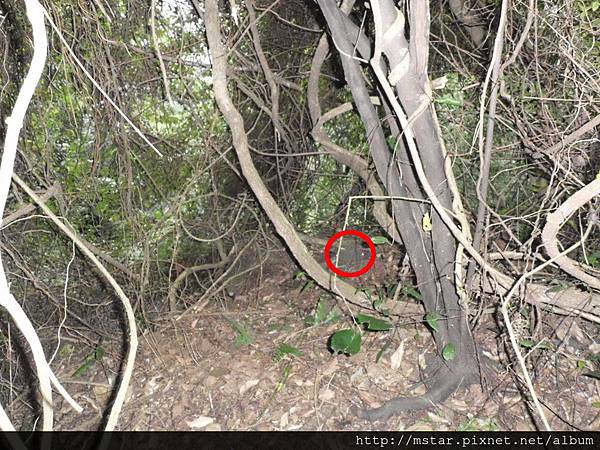 拿出刀來大加批伐,結果一不小心刀尖在左手中指割了一下,馬上流出不少血;慌忙之下沒時間拿衛生紙,趕緊用衣服乾淨處壓住傷口止血。過了一會兒,稍止住不再明顯流血後,才到背包中拿衛生紙和膠帶做簡易包紮,心裏在想:不知道是剛才踩在那座(疑似)墳墓上沒道歉、還是砍樹根導致這棵樹不爽、又或是早上對發票中了一千塊所以要受個傷平衡一下? (想太多!只是自己手拙不小心而已!)