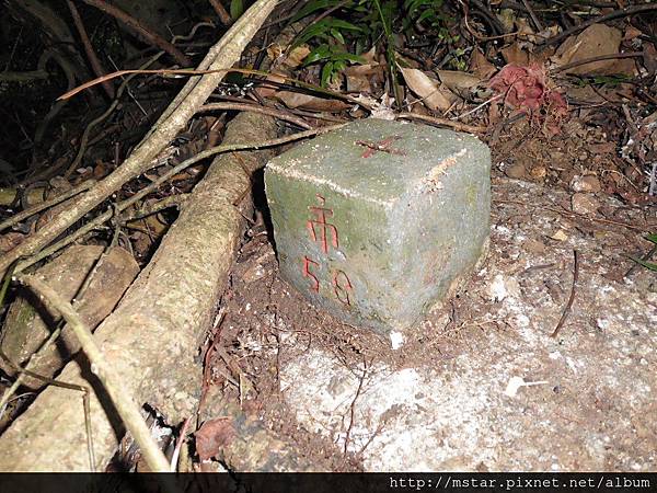還是沿稜線偏向北走,到接近的座標處卻什麼都沒看到。搜尋之後才找到位於北側、接近崖邊、被藤蔓、樹根遮住的基石。