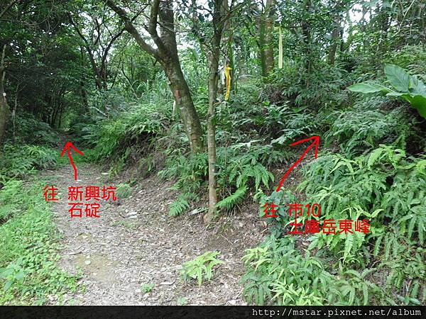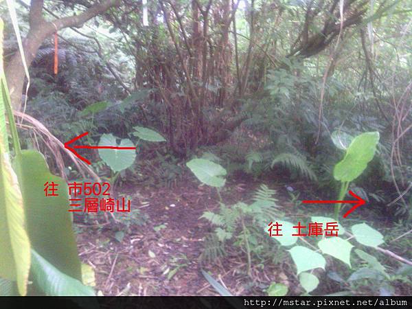 正在慶幸路徑很寬敞時,就遇到叉路,路口指標寫得很清楚:寬敞土路是下往石碇,往土庫岳方向要走上方的稜線路。