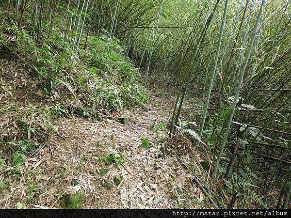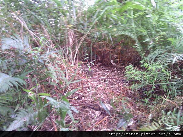 略為寬敞、稍不平的小徑,採之字形迂迴上山,接近山上後路徑變窄、雜草變多;一直往上走,遇上稜線路徑。