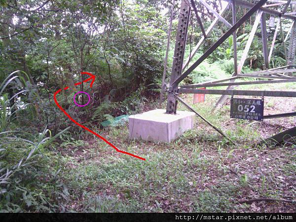 經過一個空地休息點,然後到達 052 號電塔;往左邊經過丟棄的白色安全帽 (被我掛在樹枝上做為標示用),繞往左邊的小土丘。